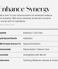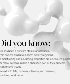Milk Protein Extract 1% + PDRN Enriched with amino acids and lactic acid from cow milk, it helps carefor skin elasticity and gently exfoliates dead skin cells. Utilizing cow milk ensures a lighter texture compared to goat milk,catering to all skin types. Plus, it incorporates PDRN, a vitalcomponent of the renowned skin booster treatment, providing care for theskin barrier. Fun fact: Did you know that milk has been used forcenturies as a skincare secret? From ancient rituals to modern beautyroutines, milk’s moisturizing and nourishing properties have made it abeloved ingredient globally. Many Koreans likely have memories of involving milk as part of theirskincare & bathtime routines. Applying milk to the face is very commonin South Korea, due to its potential moisturizing and nourishingproperties. It contains fats, proteins, vitamins, and minerals that canbenefit the skin.