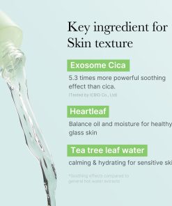 - KEY INGREDIENTS: Exosome Cica, formulated in a nano size smaller than pores, is effective for soothing and improving skin texture.Heartleaf and tea tree, it’s low irritating and is effective in balancing oil and moisture while providing hydration.