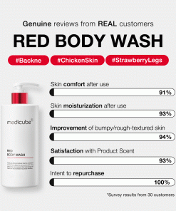 * The additional logo seal on the packaging for overseas licensing does not signify a defective/used product.#1 Body Total CareEnjoy natural and light scent, perfect for everyday use : nature-derived extracts that act as both antioxidant and fragrance. 1. High-function Body Care Helping to reduce dirt and skin cell buildup in pores 2. NO allergen-forming ingredients Red Body Wash is for sensitive skin. 3. Low PH Body washMild, low PH body wash provides skin-soothing relief. The product’s pH is between 5.5 and 6.5 The Key Ingredient for Body Care, MEDI-SOL COMPLEX with low-molecular Hyaluronic Acid and Niacinamide. Weight: 400 ml (*The following item has been repackaged for sales in the United States)